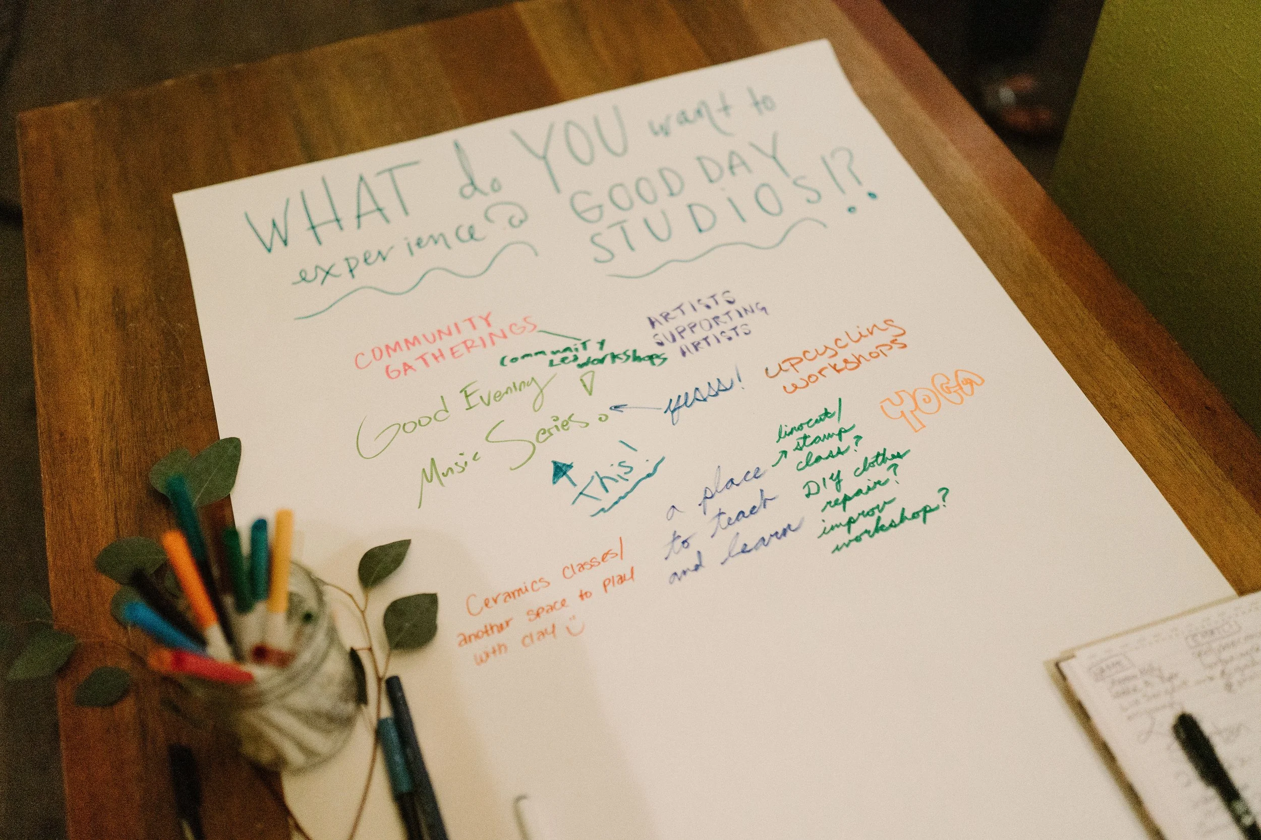 Partygoers develop the collective visioning board at the Good Day Studios kickoff fundraising party